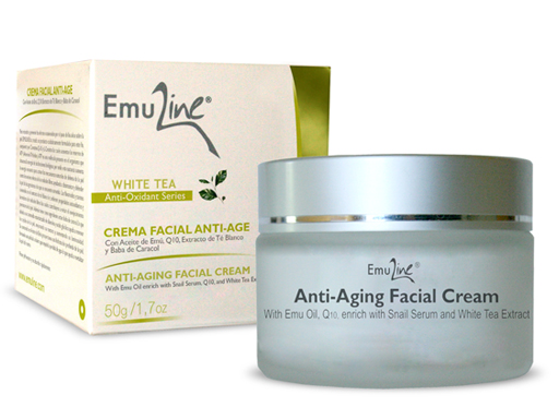 The EmuLine® Anti-age Facial Treatment Cream has been especially developed to slow down and prevent the effects produced by the passage of time on the skin. Its Emu Oil formula provides large quantities of natural antioxidants that prevent premature aging of the skin. Its high level of monounsaturated and polyunsaturated fatty acids, mainly Oleic and Linoleic Acids allow it to penetrate deep down into the layers of the skin quickly and easily, applying a deep emollient and moisturizing action. It regenerates tissues, increasing the skin cell growth activity, it helps prevent and eliminate wrinkles and blotching of the skin. It does not cause acne. The Q-10 Coenzime and the L.-Carnitine increase the energy required to activate the natural defense mechanisms of the skin against the damaging effects of free radicals, helping to detoxify and protect the skin from the onslaughts it is subject to, improving cell energy and promoting the renewal and regeneration of the skin. The anti-oxidizing and free radical sweeping properties of the White Tea Extract contribute to prevent aging and the Slimy Snail Secretion restores and regenerates skin tissues through an exfoliation of dead cells, carried out by the allantoin and glycolic acid that it possesses, improves texture and increases skin vitality.